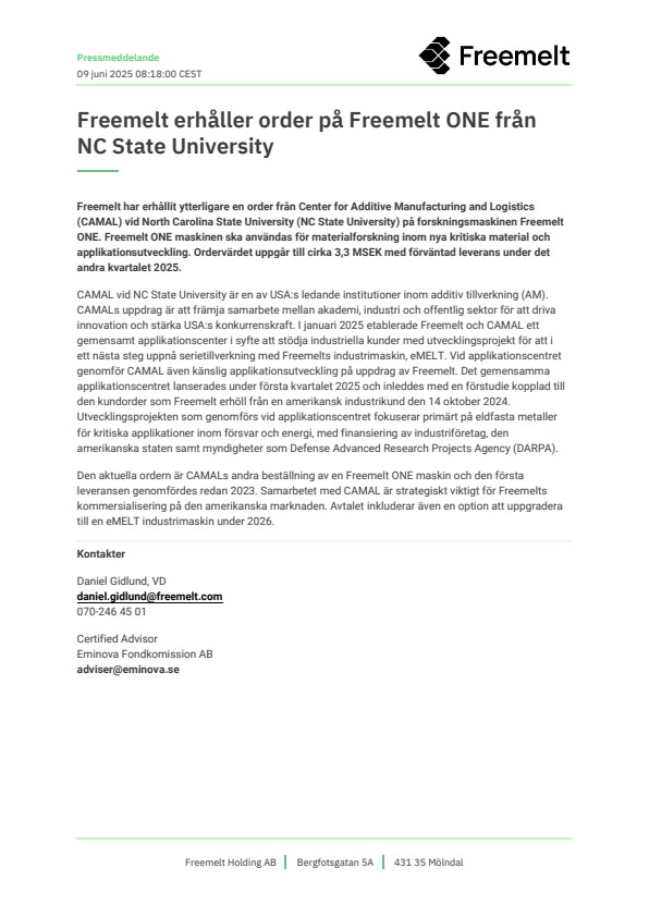 Freemelt har erhållit ytterligare en order från Center for Additive Manufacturing and Logistics (CAMAL) vid North Carolina State University (NC State University) på forskningsmaskinen Freemelt ONE. Freemelt ONE maskinen ska användas för materialforskning inom nya kritiska material och applikationsutveckling. Ordervärdet uppgår till cirka 3,3 MSEK med förväntad leverans under det andra kvartalet 2025.